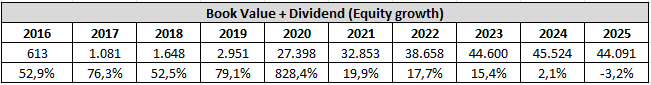 The next numbers are the book value + dividend. In my old format this was known as the equity growth rate. It was the most important of the four growth rates I used to use in my analyses, which is why I will continue to use it moving forward. As you are used to see the numbers in percentage, I have decided to share both the numbers and the percentage growth year over year. To put it simply, equity is the part of the company that belongs to its shareholders – like the portion of a house you truly own after paying off part of the mortgage. Growing equity over time means the company is becoming more valuable for its owners. So, when we track book value plus dividends, we’re essentially looking at how much value is being built for shareholders year after year. Equity has increased strongly for most of the period because Evolution has consistently generated more profit than it needs to run the business. Since the company does not require large ongoing reinvestment relative to its earnings, retained profits have accumulated on the balance sheet year after year. The particularly large jumps around 2020 to 2022 were also influenced by the NetEnt acquisition, which added substantial assets and expanded the scale of the company. The drop in 2025 does not mean the business became weaker. It mainly comes from how the company chose to use its money. Evolution spent a large amount of cash buying back its own shares, and when a company does that, the cash leaves the balance sheet and equity goes down. If the amount spent on buybacks is higher than the profit kept in the company that year, total equity will fall even though the company is still earning good money. Over time equity should continue to grow again, but probably not every single year. As long as the company earns more than it pays out or spends on share buybacks, the balance sheet will expand. Some years may still show declines if buybacks are particularly large, but that would simply reflect money being returned to shareholders, not a problem in the business itself.